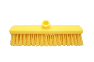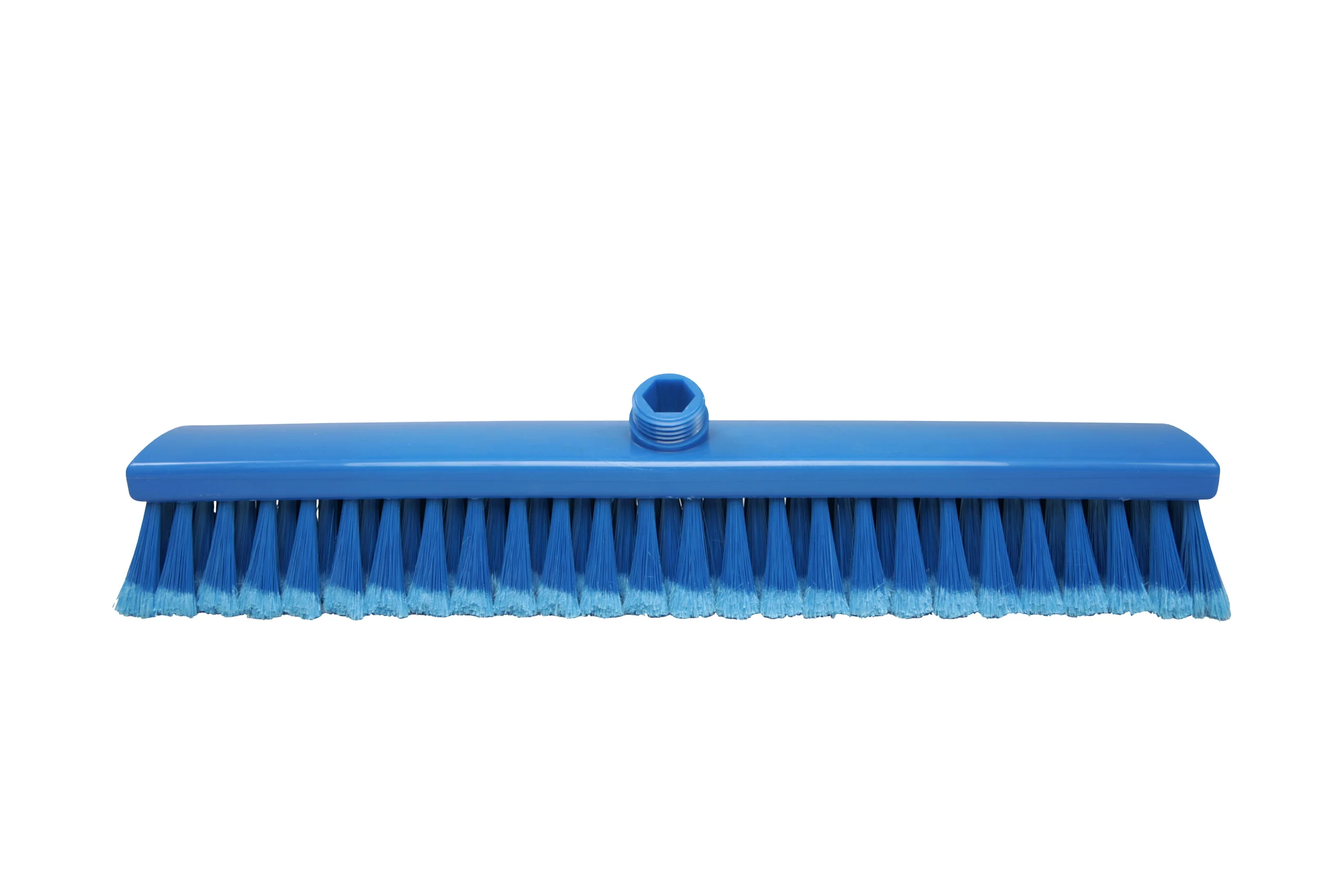 Escoba fabricada en polipropileno resistente, con filamentos de poliéster PBT de 0.30 mm y 55 mm de largo, seleccionados para un cepillado suave ideal para la mayoría de aplicaciones de limpieza ligera en suelos. Compatible con mangos de rosca externa estándar.