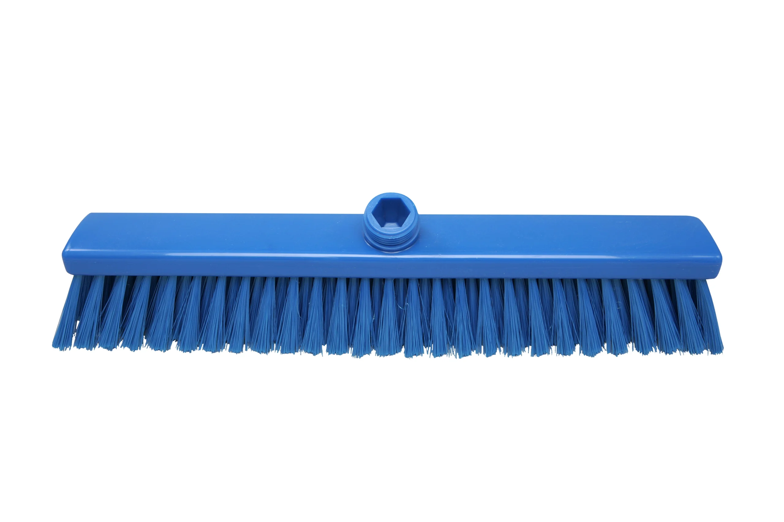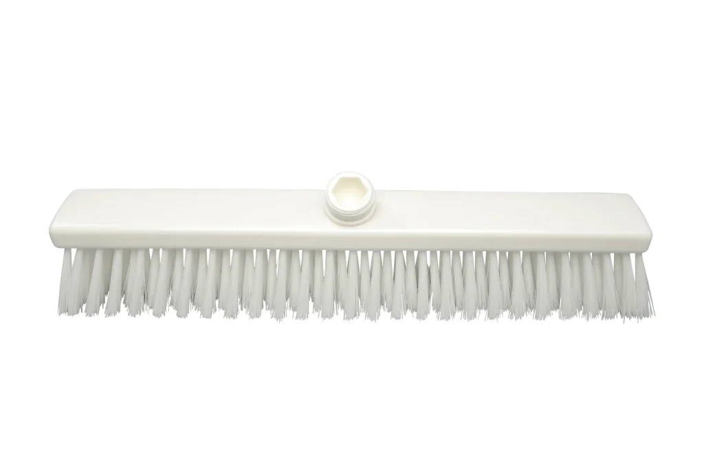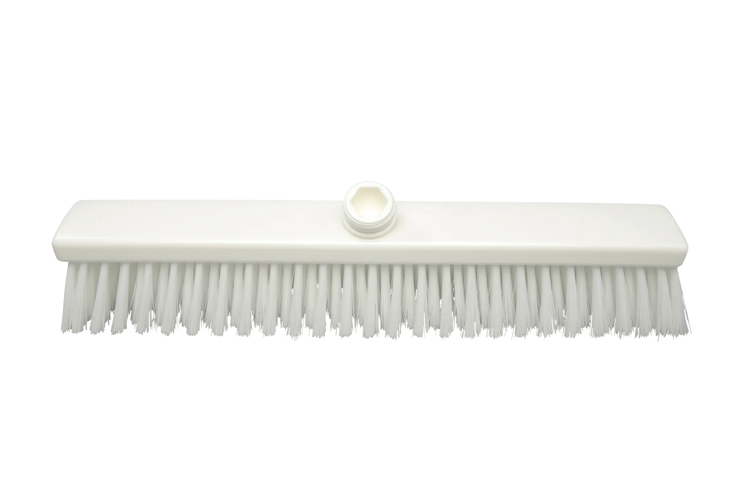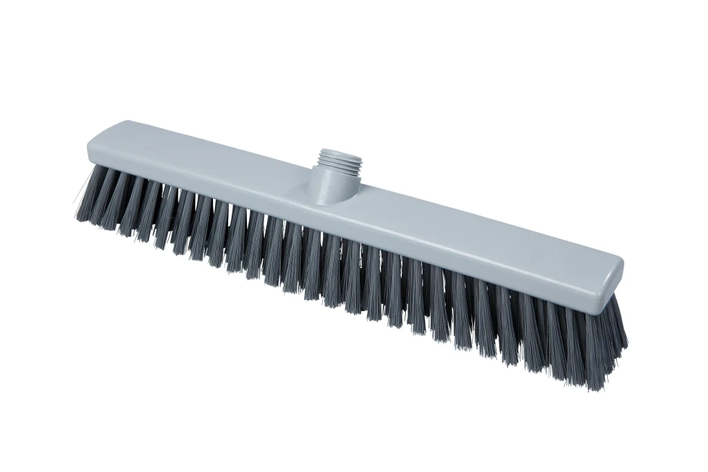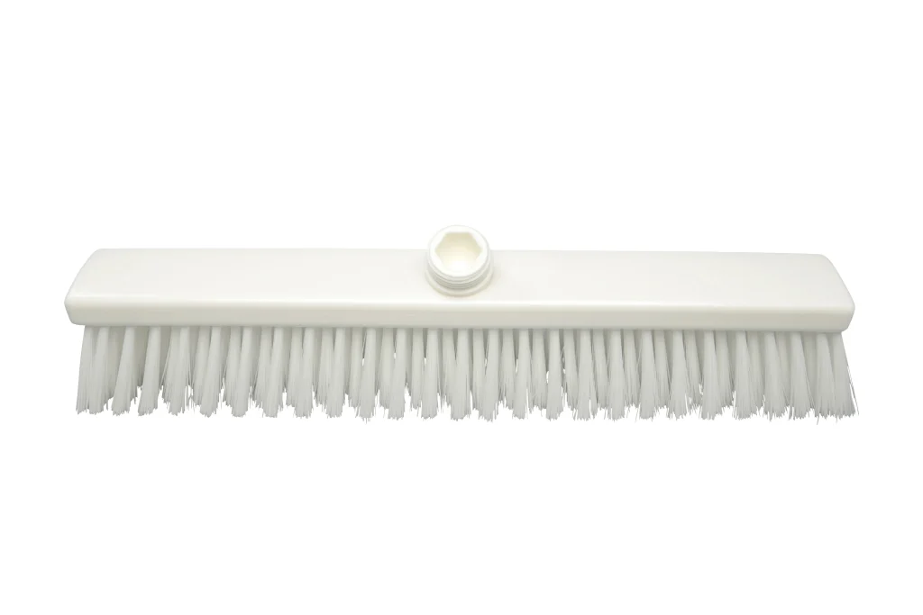 Escoba fabricada en polipropileno resistente, con filamentos de poliéster PBT de 0.30 mm y 55 mm de largo, seleccionados para un cepillado suave ideal para la mayoría de aplicaciones de limpieza ligera en suelos. Compatible con mangos de rosca externa estándar.