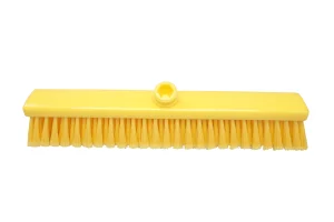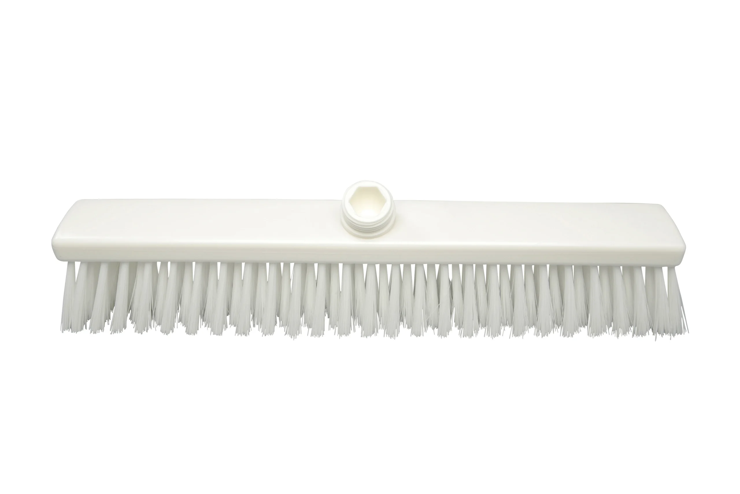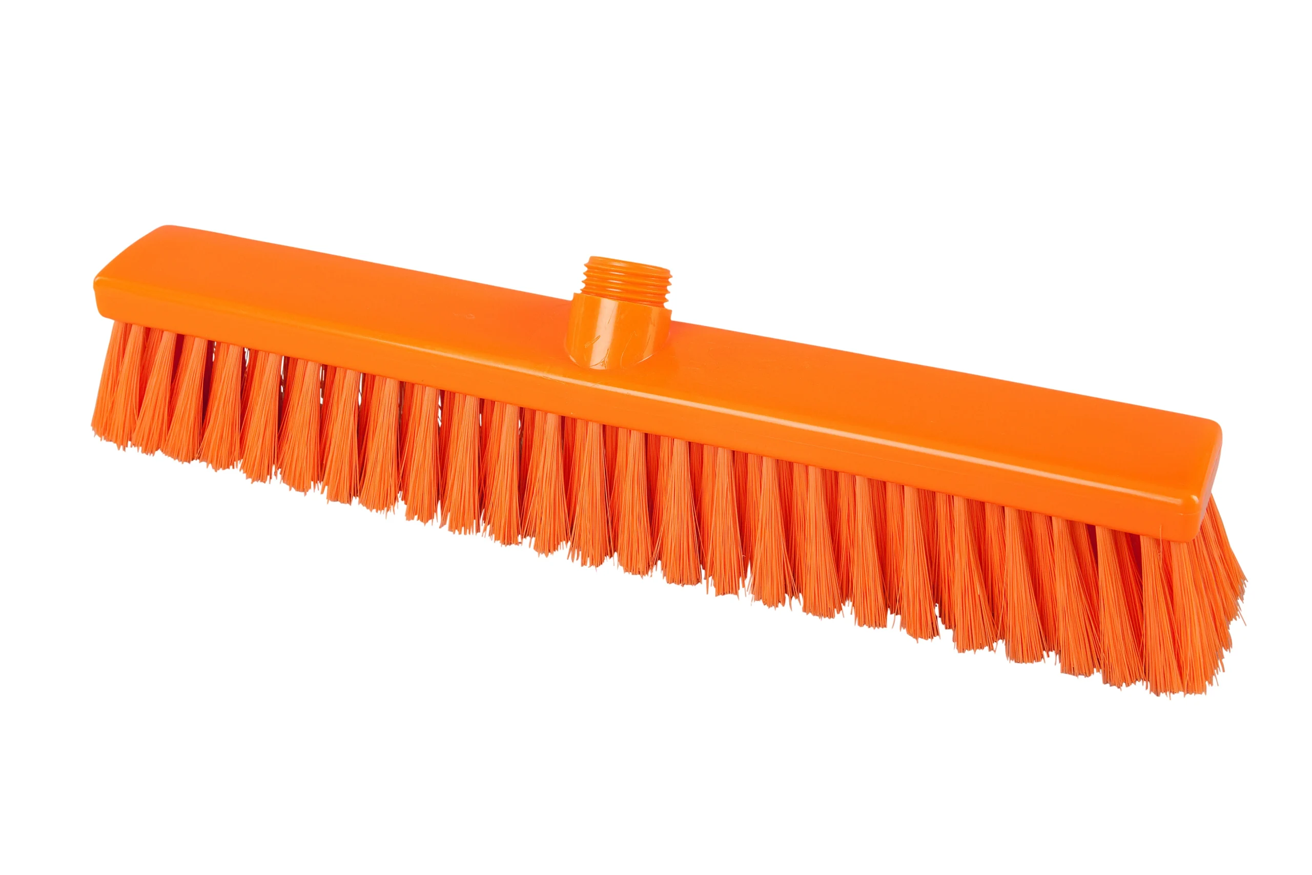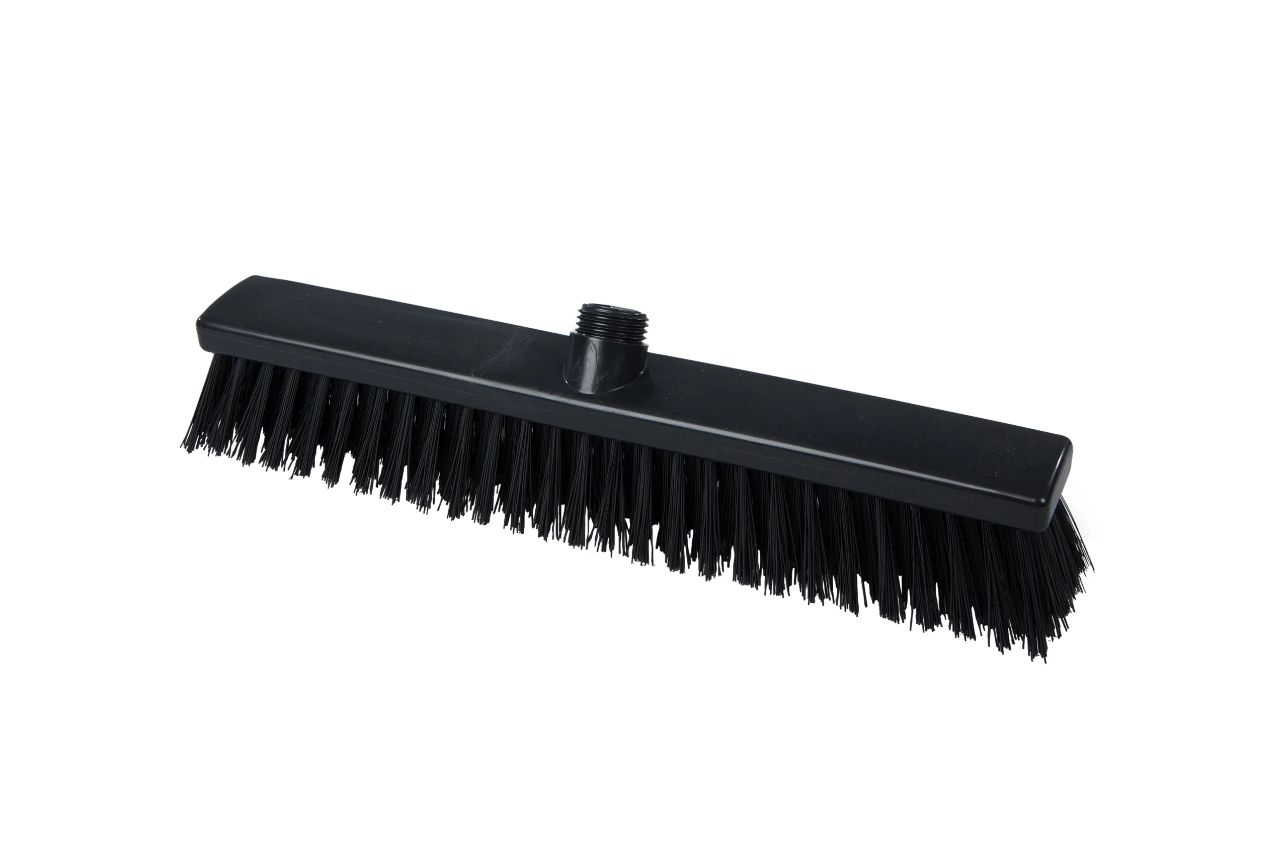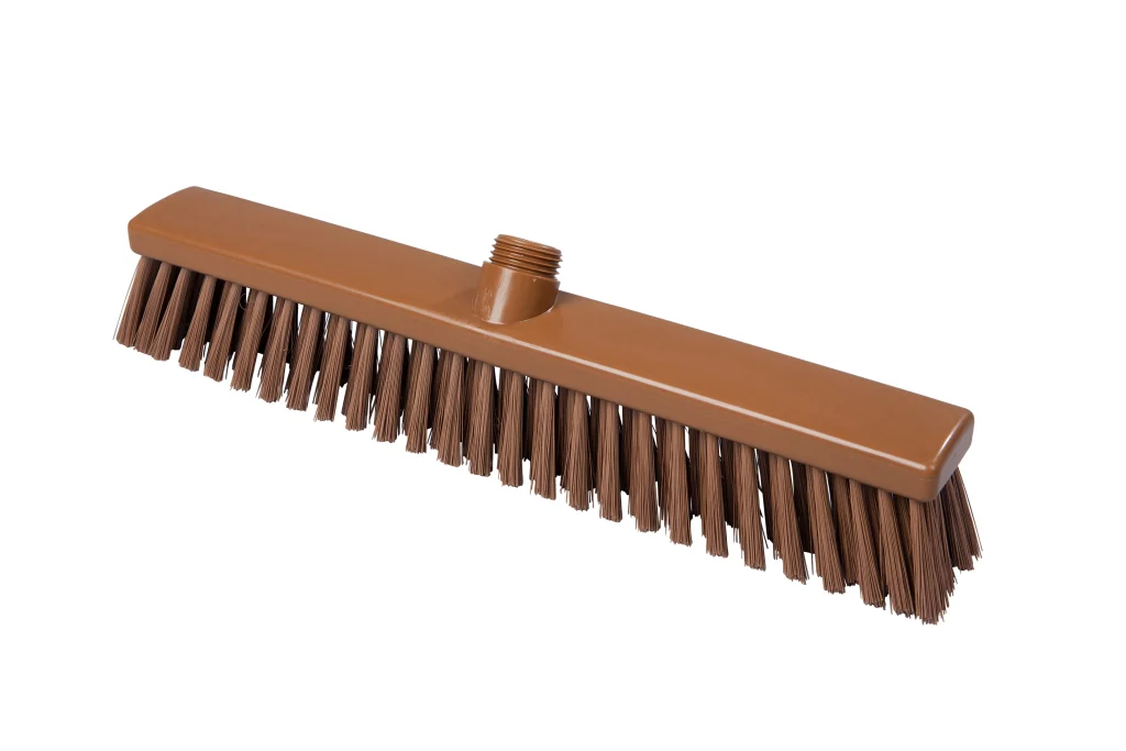 Escoba fabricada en polipropileno resistente, con filamentos de poliéster PBT de 0.30 mm y 55 mm de largo, seleccionados para un cepillado suave ideal para la mayoría de aplicaciones de limpieza ligera en suelos. Compatible con mangos de rosca externa estándar.