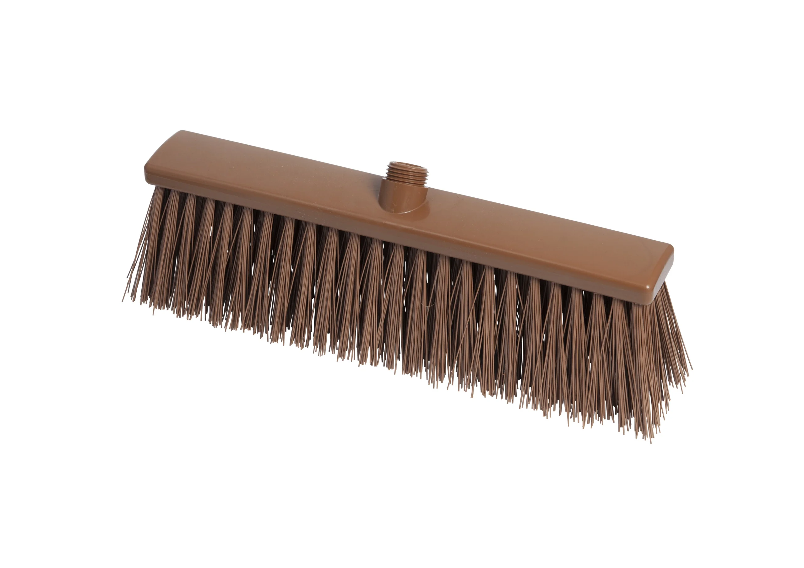 Escoba de tamaño medio con filamentos extralargos y duros, diseñada para un equilibrio entre alcance y maniobrabilidad en espacios exteriores o áreas con suciedad difícil.