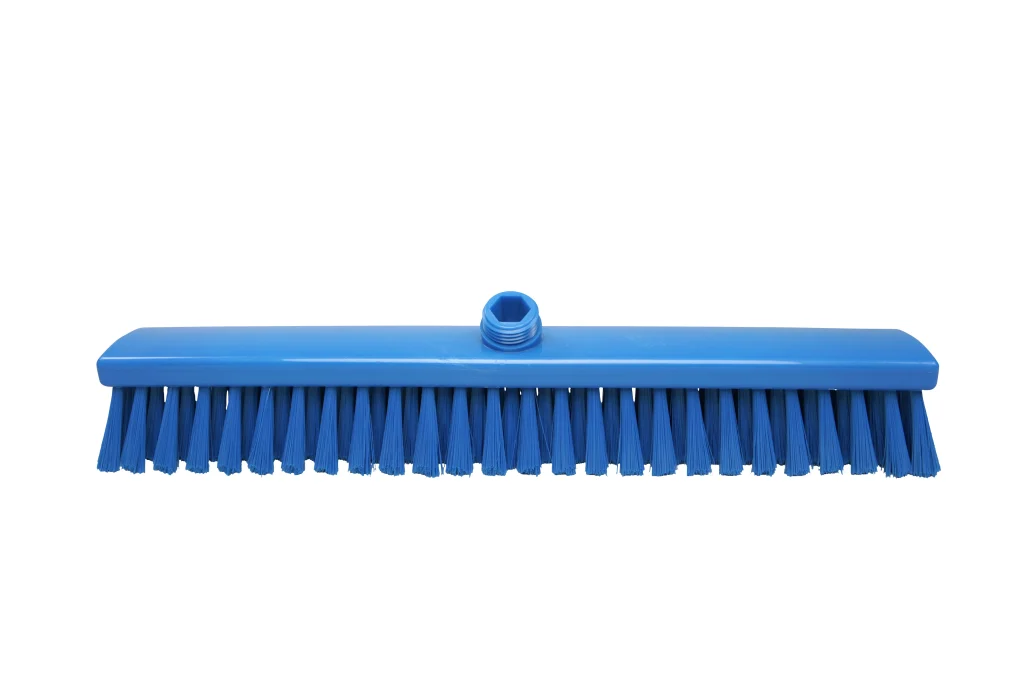 Escoba fabricada en polipropileno resistente, con filamentos de poliéster PBT de 0.30 mm y 55 mm de largo, seleccionados para un cepillado suave ideal para la mayoría de aplicaciones de limpieza ligera en suelos. Compatible con mangos de rosca externa estándar.