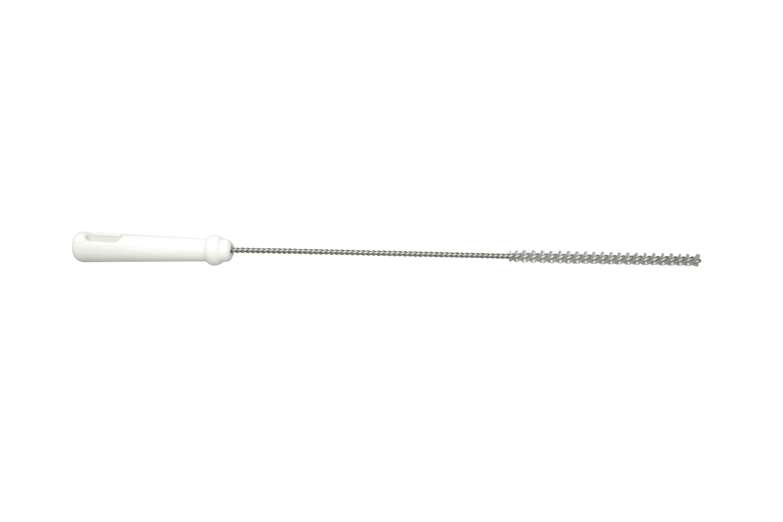 Cepillo de mano con mango largo y filamentos de poliéster PBT de dureza media, con radio de 10 mm. Ideal para limpieza detallada en tuberías pequeñas, permite acceder con facilidad para remover residuos y mantener la higiene en espacios estrechos y exigentes.