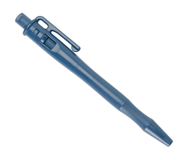 Lápiz retráctil detectable con tinta presurizada azul. Funciona de forma consistente sobre superficies con humedad, grasa o polvo. Cuerpo moldeado en plástico detectable, clip fuerte, diseño ergonómico y cartucho de alta presión. Apto para zonas exigentes.