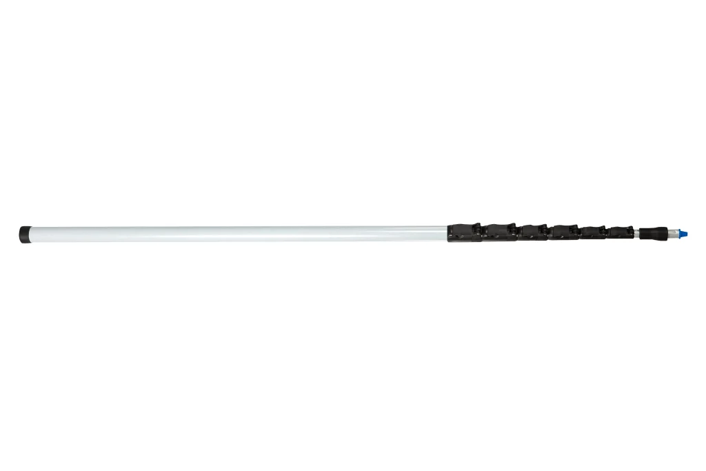 Mango telescópico extra fuerte de fibra de vidrio, ajustable de 1900 a 9500 mm. Ideal para limpieza en zonas de gran altura o profundidad. Sistema de rosca externa.